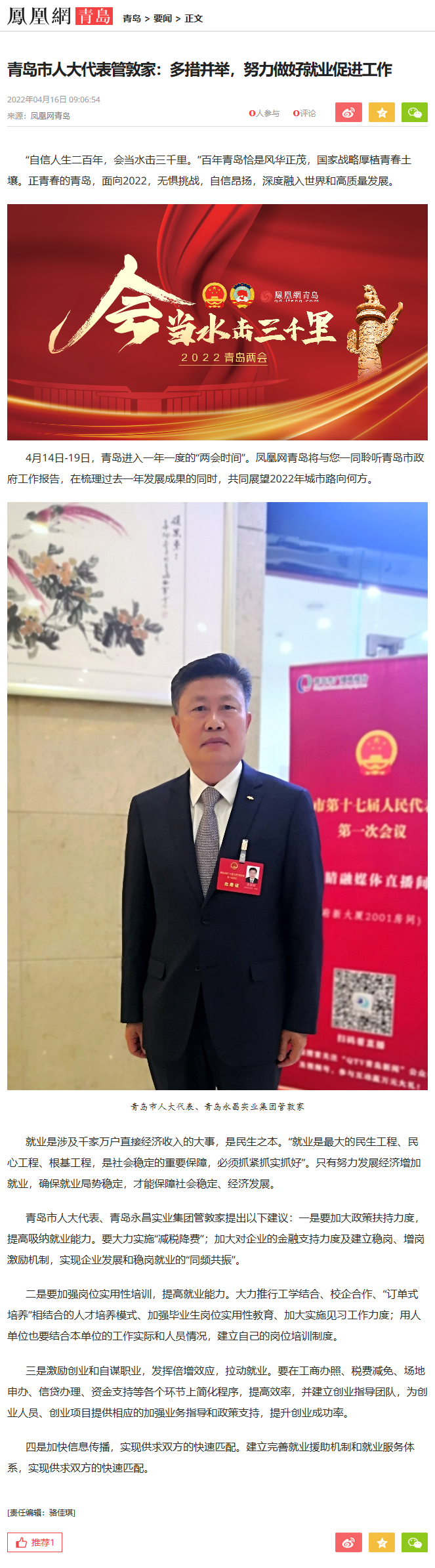 四是加快信息传播,实现供求双方的快速匹配。建立完善就业援助机制和就业服务体系,实现供求双方的快速匹配。(下附凤凰网青岛原文截图)