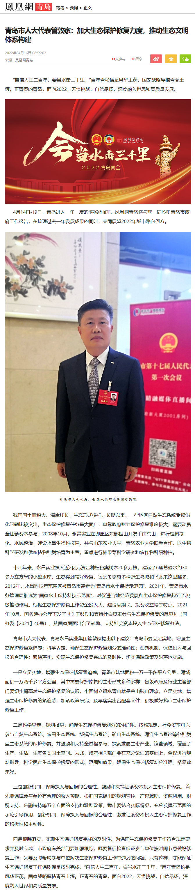 四是跟踪落实,实现生态保护修复完成的及时性。为保证生态保护修复工作符合规定要求并及时完成,市政府有关部门要加强跟踪,既要督促检查保证参与单位按时间节点做好修复工作,又要及时帮助参与单位解决生态保护修复工作中遇到的问题,只有这样,才能保证生态保护修复工作保质保量按时完成。“自信人生二百年,会当水击三千里。”百年青岛恰是风华正茂,国家战略厚植青春土壤。正青春的青岛,面向2022,无惧挑战,自信昂扬,深度融入世界和高质量发展。(下附凤凰网青岛原文截图)